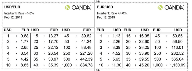 A better alternative to a paper-based currency cheat sheet is Oanda's online currency converter. It has a clean, responsive design with plenty of pairs to compare.