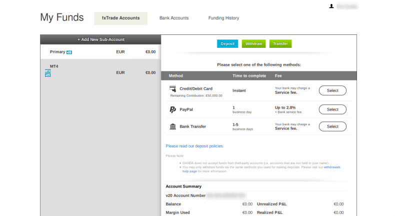 Oanda charges no deposit and account fees. You can withdraw your money free of charge to a debit/credit card, but bank transfer withdrawals are quite costly.